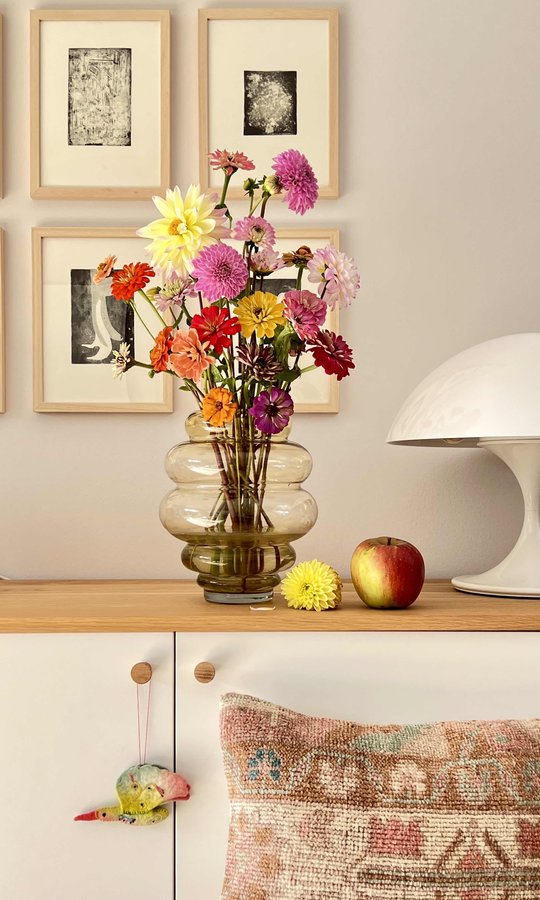 Herbst, Stilleben, Sideboard, Tischleuchte, Martinelli, Luce, Kelim, Kissen, Vase, Dahlien, Zinnien, Oktober, 2023, Bilderwand, Kupferstiche