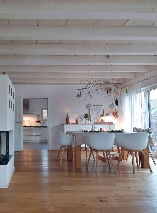 wohn essbereich, Wohnzimmer, Esszimmer, Kaminofen, Parkettboden, skandinavisch Wohnen, Hygge, Zwischen den Jahren, Winterdeko, Winterdekoration, Ikea Hack, Sideboard, Holzboden Eiche geölt, Holzhaus