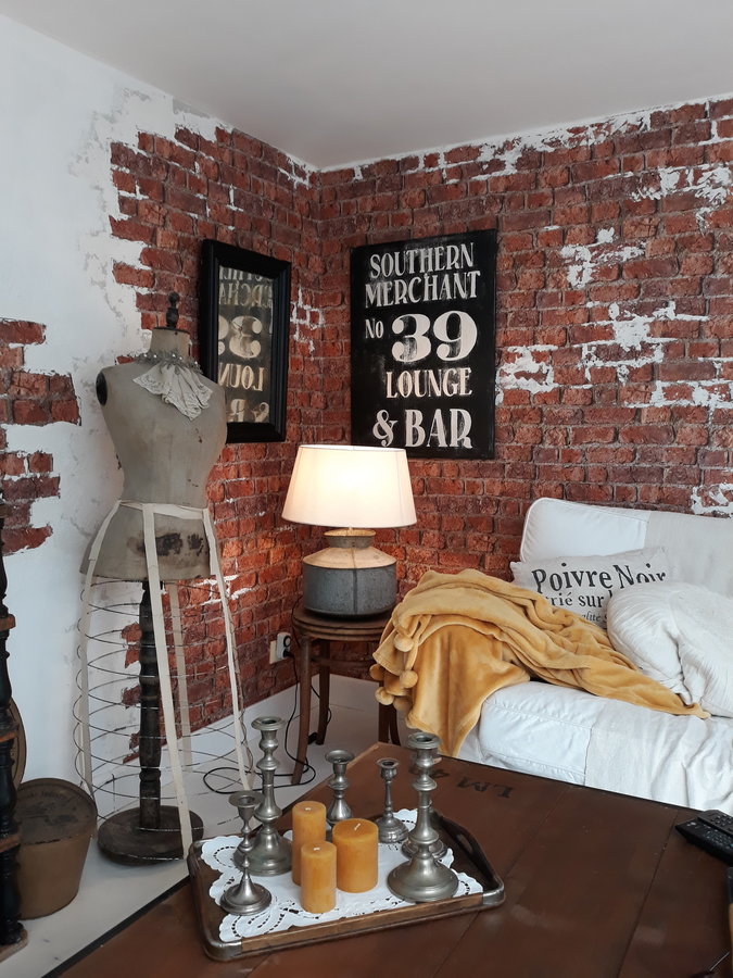 Wohnzimmer, Brickwall, Steintapete, gelbe Decke