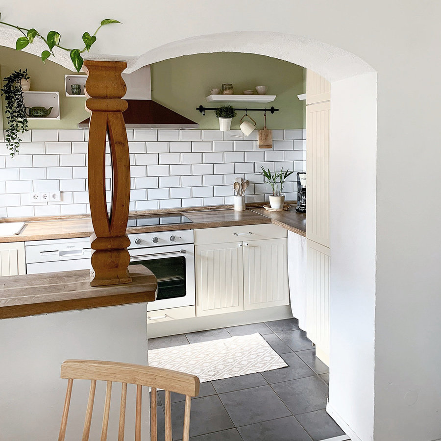 Küche, Küchenblock, Küchenbuffet, Küchendeko, Grün, Pflanzen, Pastellfarben, Pastell, Naturtöne, Metrofliesen, Holz, Holzliebe, Japandi, Skandi