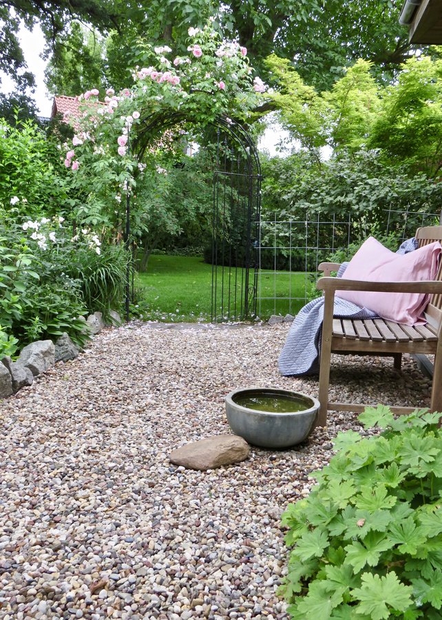 Gartenimpressionen, Gartenbank, wasserschale, Decke, Kissen, Rosenbogen