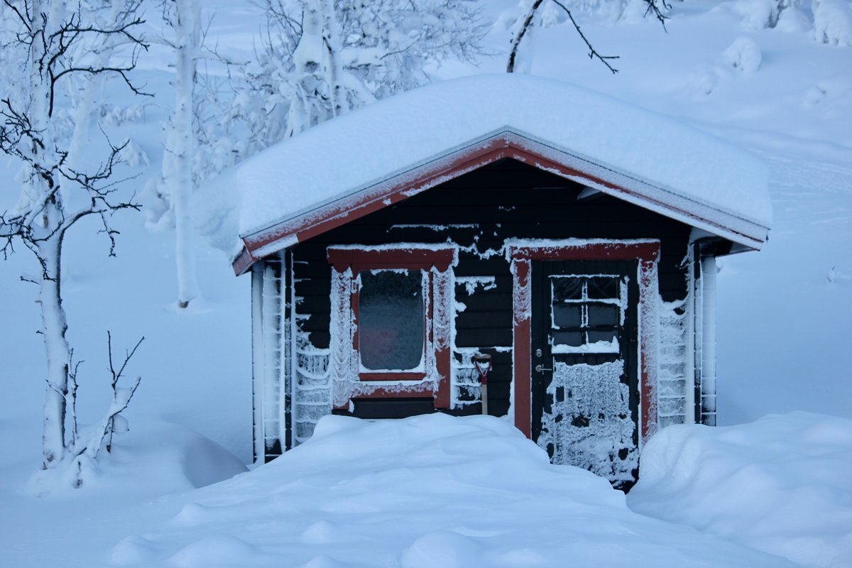 Blick auf unser Gartenhaus in Schweden, ein Blick in eine entschleunigte Welt. Der Schnee klebt wie Zuckerwatte dran. Die Temperaturen lagen gestern in der Nacht bei - 15°C.