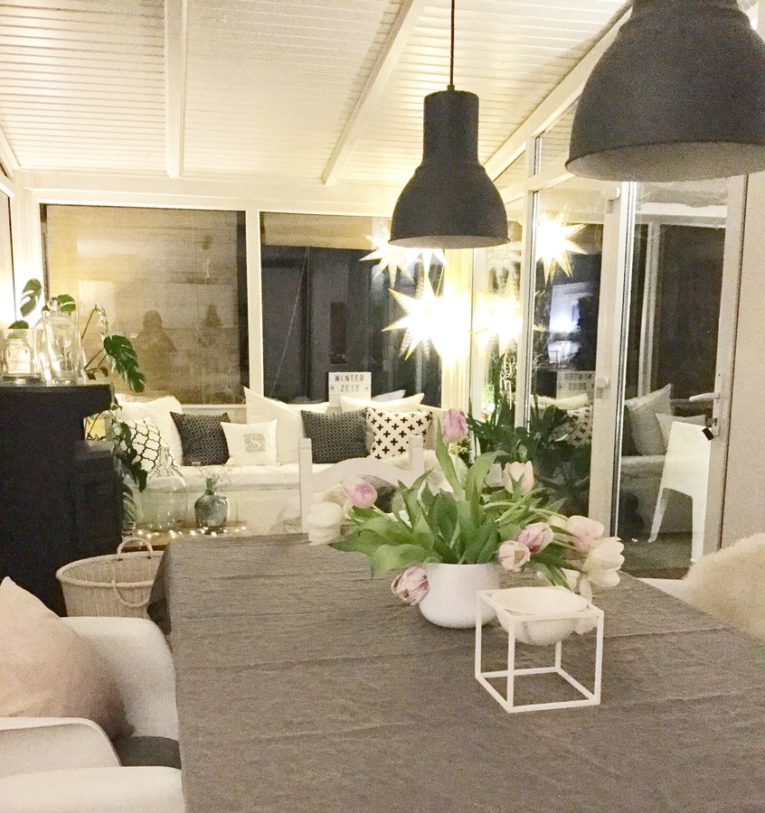 Esstisch, Wintergarten, Tulpen, Sterne, Leinentischdecke