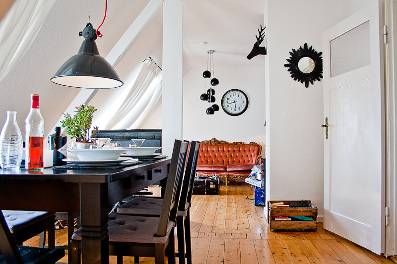 Der derzeitige Blick ins Wohnzimmer. Viel Chaos, aber sobald oben alles ausgebaut ist, wirds hier deutlich luftiger sein. Neu ist den Pendelleuchte über dem Sofa, ein Koffer dient übergangsweise als Couchtisch. Links neben dem Sofa kommt eine riesige Lampe von myfab. So soll wohl Ende Juni geliefert werden. Der Esstisch steht jetzt nicht mehr an der gegenüberliegenden Wand, sondern unter der Schräge.