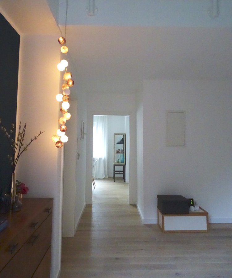 Galerie, Gestaltung Eingangsbereich, Kugelleuchte, Vitrine, Vintage Kommode