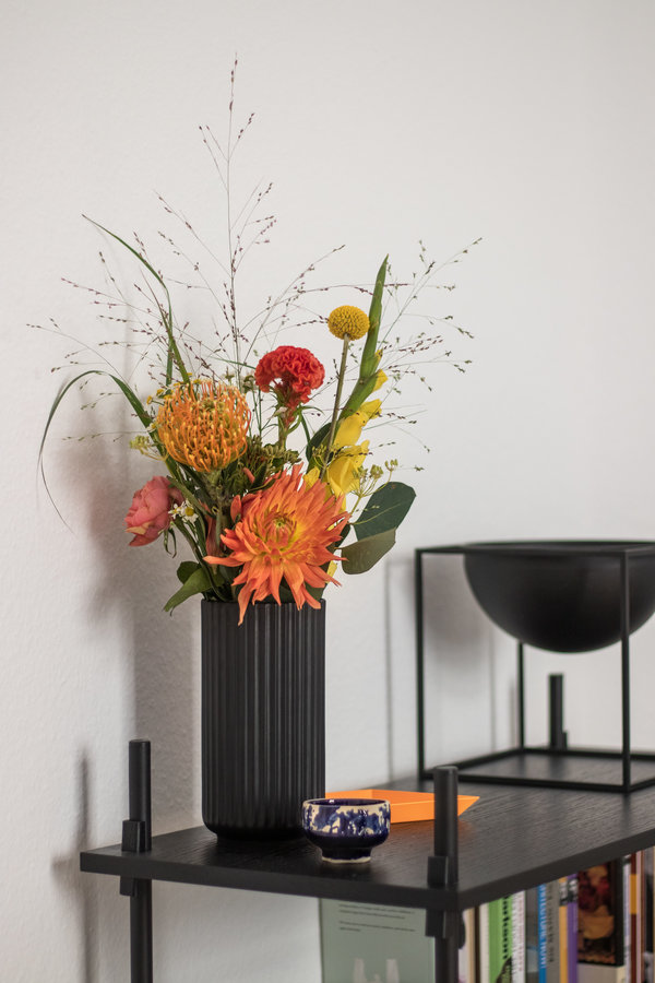 Blumenliebe, Blumenstrauß, Regal, Schwarz, Vase, Interior Design, skandinavisch Wohnen, Flowers, Schale, Holz, Metall, Porzellan, Orange, Gelb, Grün, Blumendekoration, Blumenvase, Floristik, Black and white, Farbenfroh, Farbe