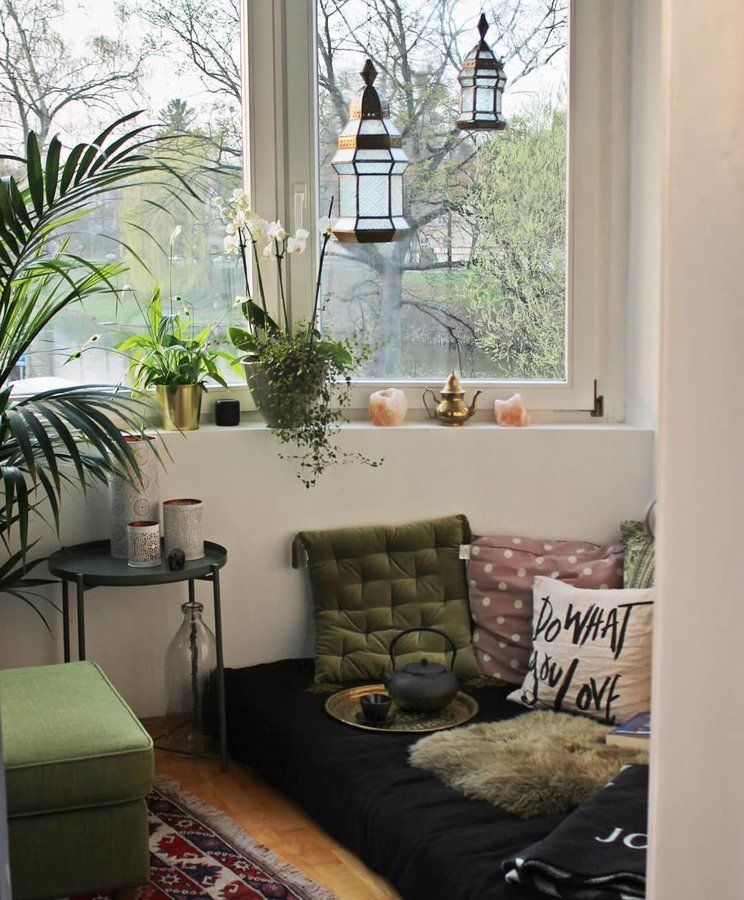 Unseren kleinen Anbau am Wohnzimmer haben wir in eine gemütliche Boden-Sitzecke verwandelt. Ich wollte schon immer so eine kuschelige Ecke haben und nun hat uns unsere neue Wohnung endlich Gelegenheit dazu geboten 🙃 Viel grün, unterschiedliche Kissen und ein goldfarbenes Tablett aus Marokko verschaffen ein gemütliches Flair.