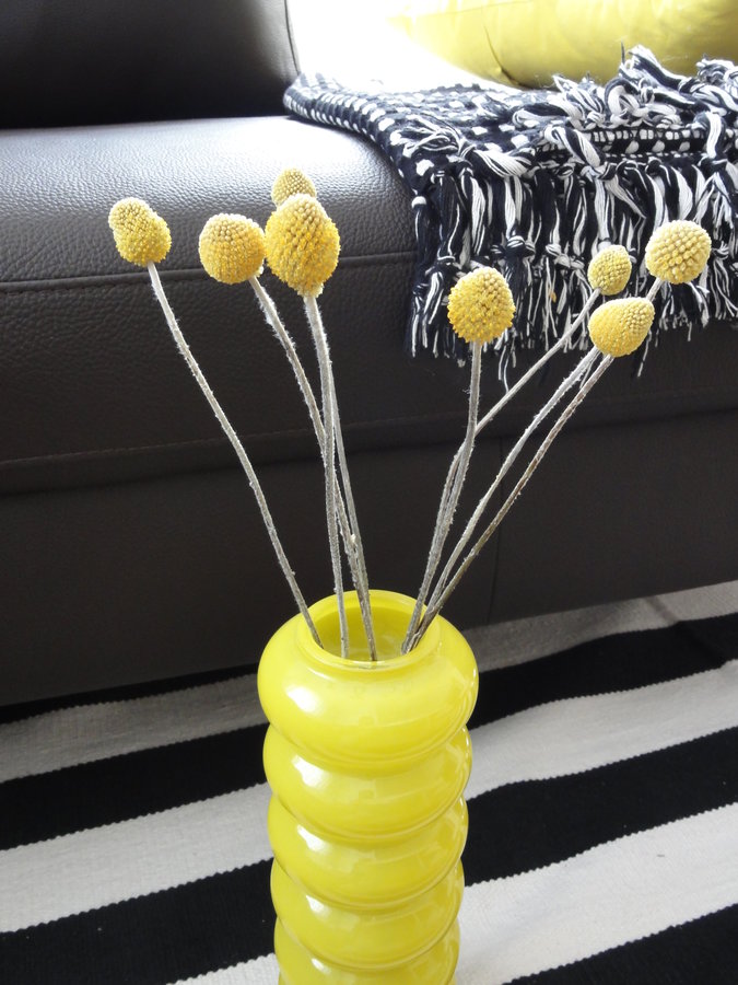 Craspedia Trommelstock, Braune Ledercouch, Schwarz weiß Teppich, Kissen gelb