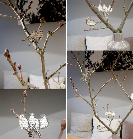 Tischdeko, Osterstrauß, Vogel, Teekanne, Buchrecycling