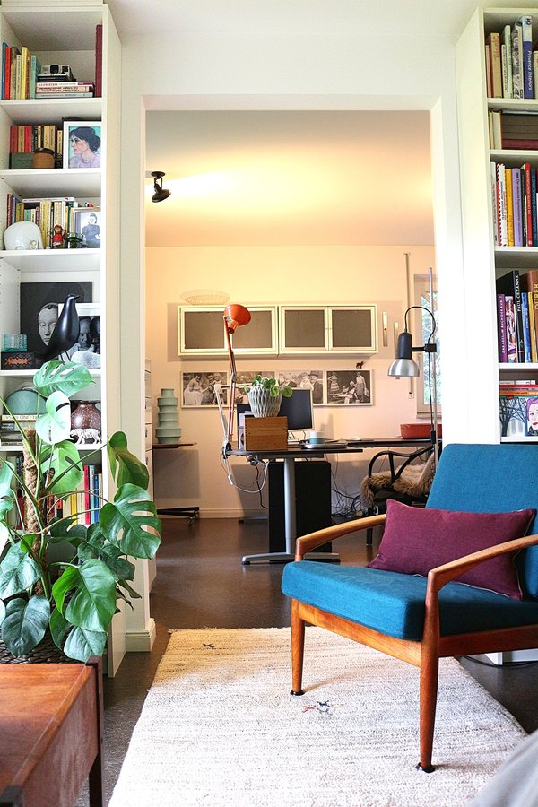 Teak, Sessel, Orientteppich, Bücherregal, Stehleuchte, schreibtischleuchte, Bunt, Farben, Monstera, Wohnzimmer, Midcentury