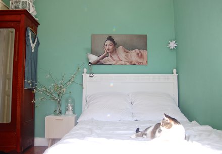Schlafzimmer, Jugendstilschrank, Kleiderschrank, Antik, Nostalgie, Frühlingszweige, Zweige, Frühling, Billy Hells, Asiatisch, Chevron, Triangle, Graphisch, Geometrie, Glasglocke, Glasdom, Vogel Sulptur, Salbei, Altbau, Holzdielen, Stuck, coon, Damant, Bett, Vintage, Wandfarbe, Türkis, Vintage Schlafzimmer, Wandfarbe türkis
