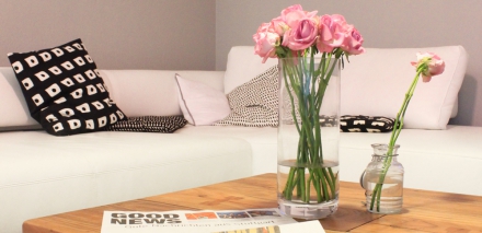Hier ein Einblick von der Espresso-Küchenecke aus auf die Couch mit ein paar neuen Kissen