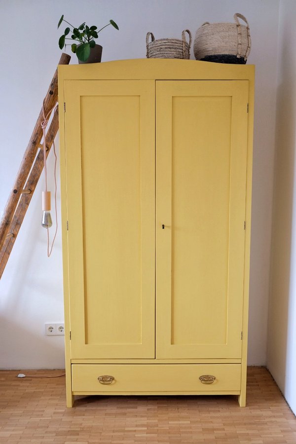 Gästezimer, gelber Schrank, DIY, Alter Schrank, Holzleiter, Körbe