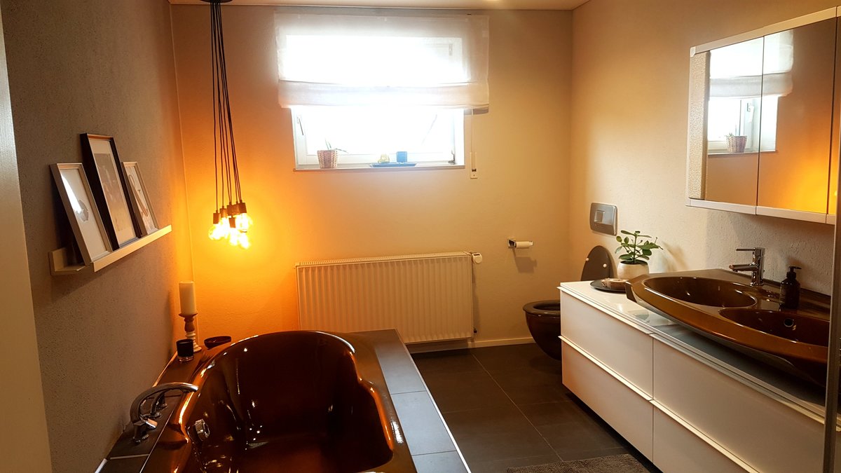 Das ehemals raumhoch geflieste Bad mit Holzdecke habe ich verputzt und gestrichen, die Bodenfliesen erneuert und in eine Spanndecke investiert - ich finde, das Ergebnis kann sich sehen lassen, oder?