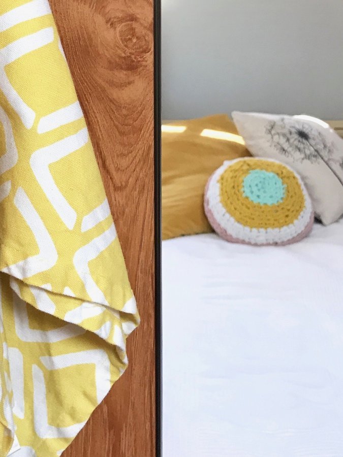 das ist der blick von der hymerküche aufs bett. das kissen von eva ist nicht nur schön, sondern auch äusserst praktisch.