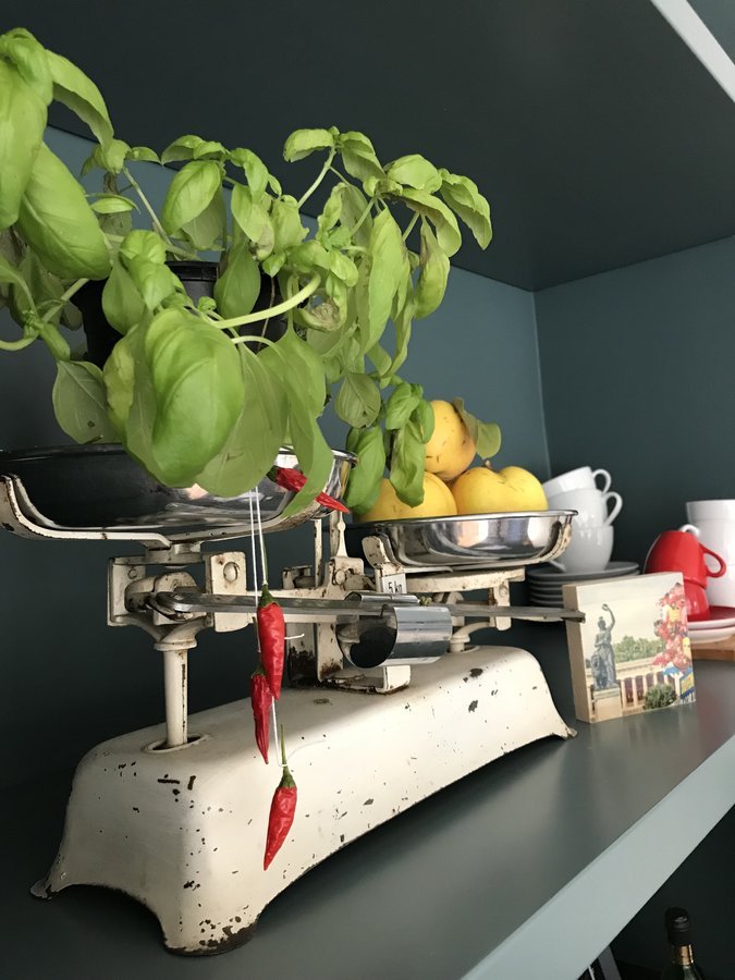Das ist ein Ausschnitt aus meiner Küche mit meiner Waage, die schon meine Oma benutzt hat und meinem kleinen Münchenbild, ein Abschiedsgeschenk, das ich so sehr liebe.