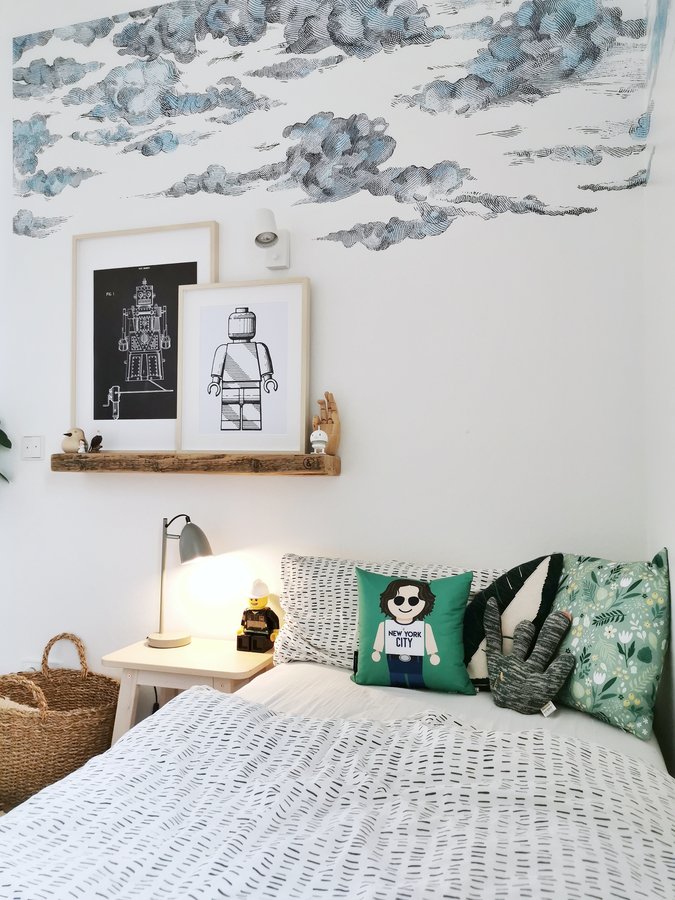 Kinderzimmer, Jungszimmer, Tapete, Bilderleiste, Bett, Holzleiste