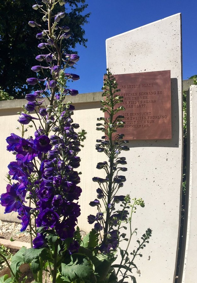beton, Kupfer, Rittersporn, Blau, Inschrift