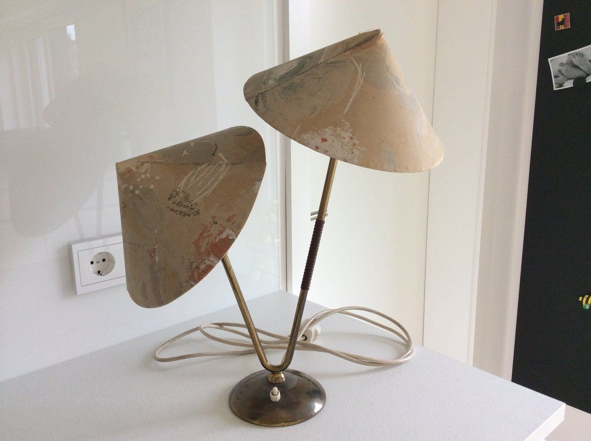 Die lampe stammt aus den 50/60er Jahren, hat zwei Textilschirme und funktioniert! Eine Glühbirne ist defekt, aber da es sich um eine e14-Fassung handelt sollte ein Ersatz kein Problem sein. Eine so alte Lampe hat natürlich Gebrauchsspuren - einer der Schirme hat Löcher in der Spitze. Bei Interesse kann ich davon gerne Bilder schicken.