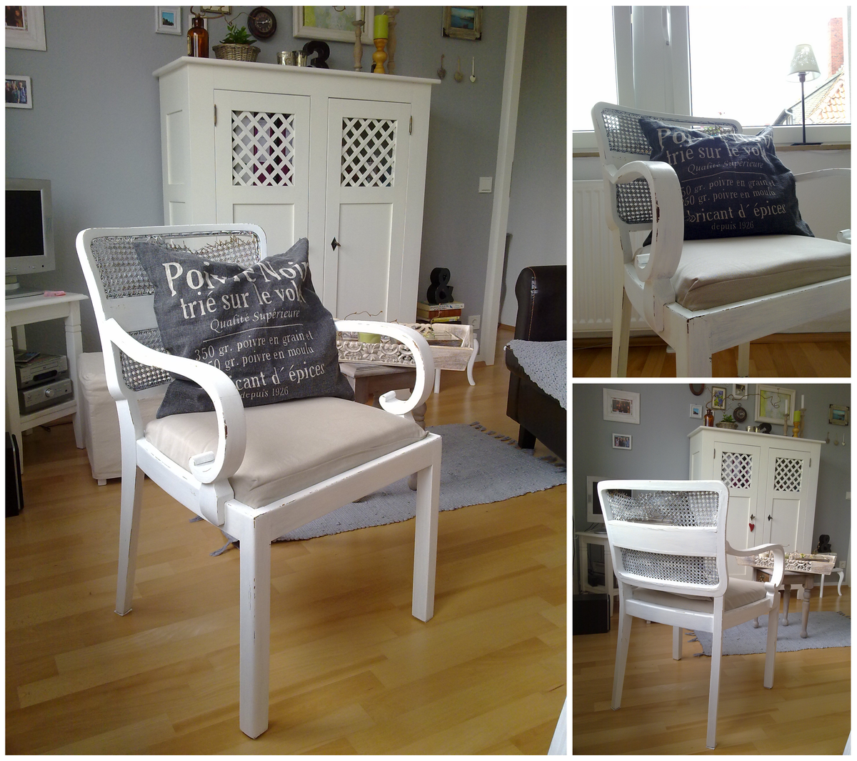 Und da steht er nun, mit viel Liebe und Zuwendung aufgepeppelt, gestrichen, gepolstert und bezogen in meinem Wohn"zimmer". Und macht sich dort ganz gut, wie ich finde.