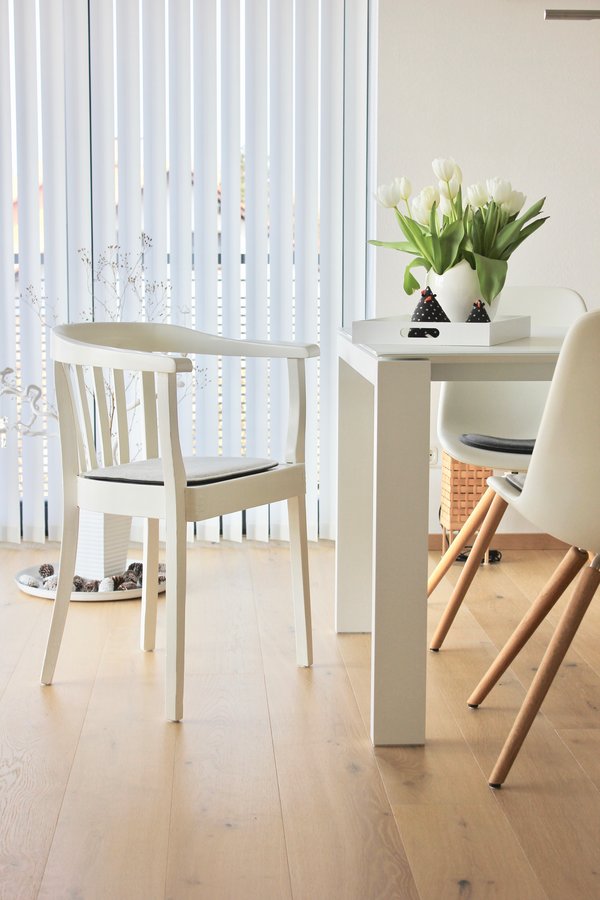 Sperrmüll, Stuhl, Esstisch, Stühle, Tulpenstrauß, bodentiefes, Fenster, Parkettboden, Esszimmer