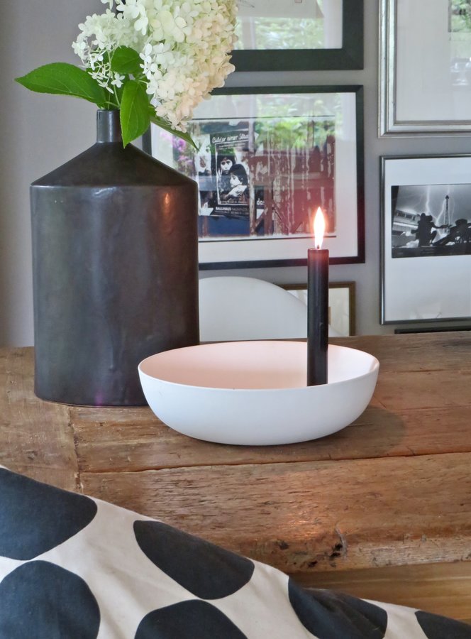 Kerzenhalter, Kissen, Tisch, Vase, Bilderwand