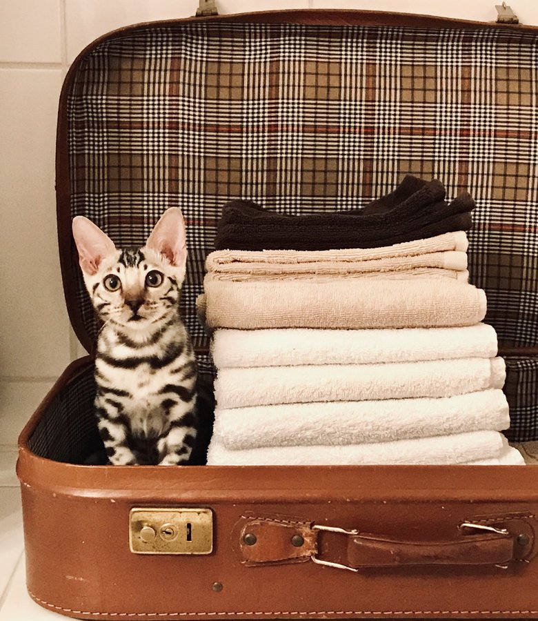Der alte Lederkoffer dient uns als Handtuch-Aufbewahrung im Bad. Er stand zum Entsorgen auf dem Sperrmüll und tat mir irgendwie leid. Das Schild mit der Adresse des Besitzers in altdeutscher Schrift hängt sogar noch dran und ich habe schon oft überlegt, wohin der Koffer seinen Besitzer wohl schon überall begleitet hat. Jedenfalls hat er jetzt ein zweites Leben und scheint auch ein kuscheliges Plätzchen zu sein für kleine Fellnasen 🐱