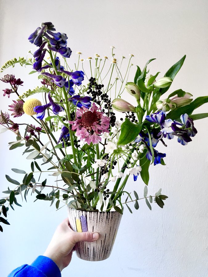 Blumen, Vintage Blumentopf, Skabiose, Craspedia, Rittersporn, Alstromerie