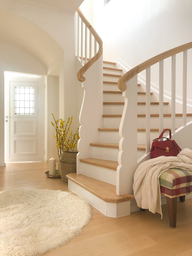 Der Eingangsbereich mit der wunderschönen Treppe ist eines meiner Lieblingsbereich in unserem Haus. Wir haben in vielen Stunden die alte Farbe von der Treppe und dem Geländer entfernt und sind von dem Ergebnis total begeistert. Der ganze Eingangsbereich strahlt und empfängt den Besucher mit warmen Tönen und ganz viel Gemütlichkeit.