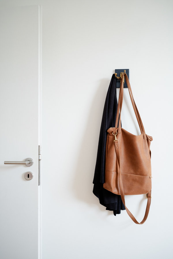 Der Gaderobenhaken kommt aus einem kleinen Vintage-/Plattenladen bei uns ums Eck. Das dunkle braun habe ich blau gestrichen mit Farbe, die ich noch zuhause von einer Bank hatte. Durch die drei Ärmchen macht der Haken sich super in meinem Arbeitszimmer für meine Handtasche und die Strickjacke oder bei Besuch für die Kleidung der Gäste.