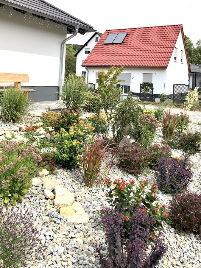 Vorgarten, Holzbank, Insektenfreuden, Kunterbunt