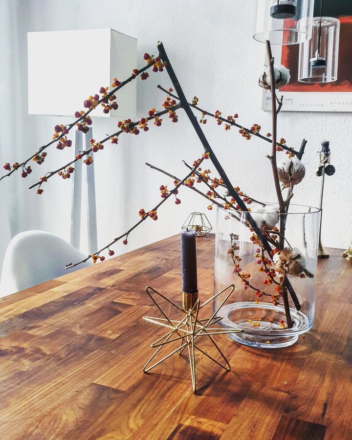 Der Winter ist nun auch auf dem Tisch eingezogen. Auch wenn dieser Ast keinen Schönheitswettbewerb gewinnt, besticht er mit seinen satten Farben und repräsentiert die kalte Jahreszeit im heimischen Wohnzimmer. Ich liebe es auf jeden Fall und pflegeleicht ist diese Anordung auch noch 🍂😉