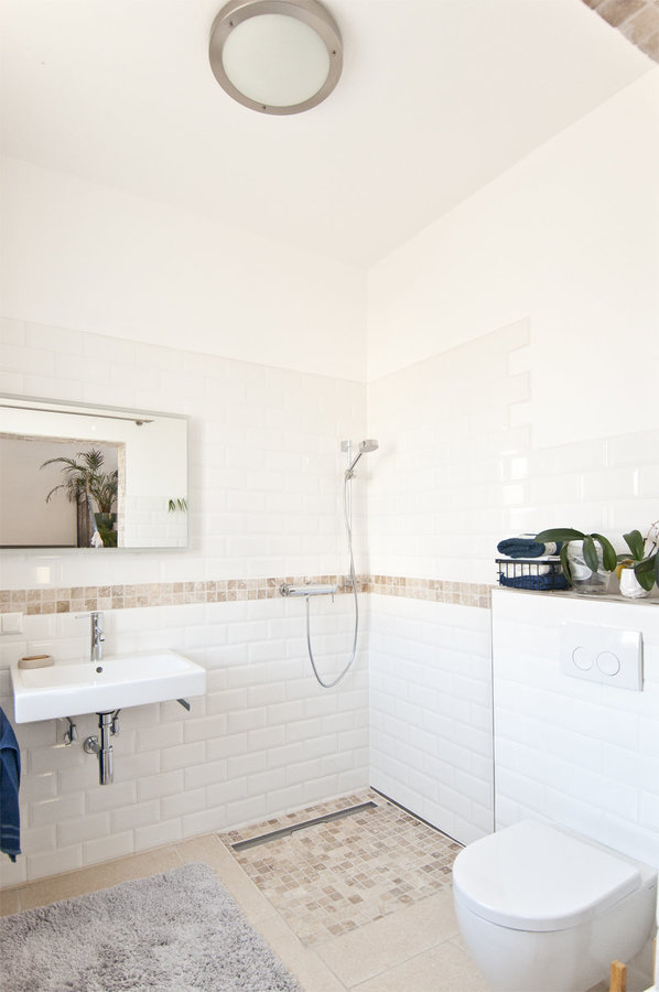 Die Fliesen habe alle ich alleine verlegt, abgedichtet haben wir gemeinsam. Bei der ersten Ladung zu viel Abdichtmasse angemischt. Da haben wir den geringen Platz und das Einarbeiten der Bänder, Ecken etc. unterschätzt ... Das Verfugen der Metrofliesen fand ich deutlich zeitaufwendiger als das Verfugen nicht facettierter Fliesen. Eigentlich waren Duschwände geplant aber ohne wirkt es größer und ist viel praktischer. Da das Bad nur 4 m² groß ist, ist auch der Boden nach dem Duschen fix abgezogen und außer dem WC wird eigentlich nicht wirklich was nass ...