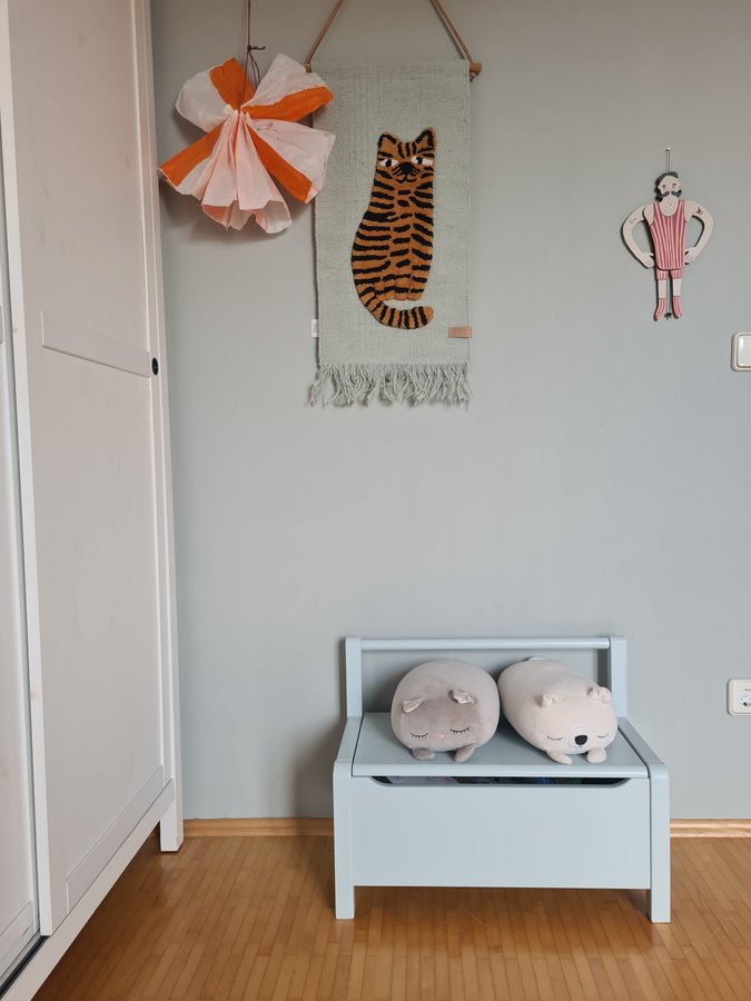 Die hellblaue Truhenbank ist neu im Kinderzimmer. Die Zwillinge verstauen jetzt ihre kleinen Schätze darin und ich finde sie (die Bank; die Kinder meistens auch) einfach nur süß.