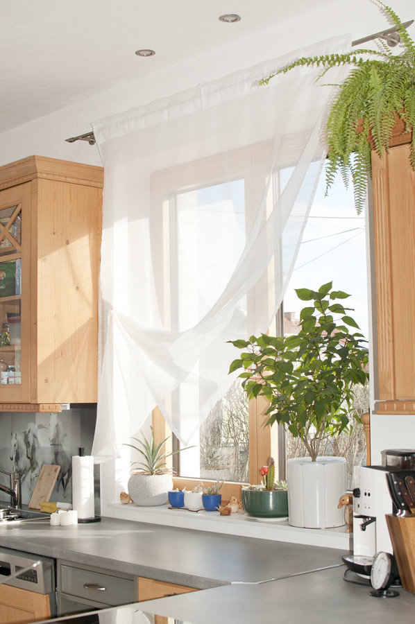Den Vorhang hab ich einfach grad abgenäht und dann mit einem kleinen Magneten am Kantenschutz von der Fensterlaibung hochgenommen. Ohne Vorhang sieht man sonst von der Straße so stark hinein und einfach runterhängen wäre zwecks diverser Küchenarbeiten und Spritzereien von der Spüle nicht so praktisch. Der Weihnachtsstern war mal so ein kleines Pflänzchen und ist mittlerweile ein richtiger Strauch, der einen tollen Sichtschutz abgibt.