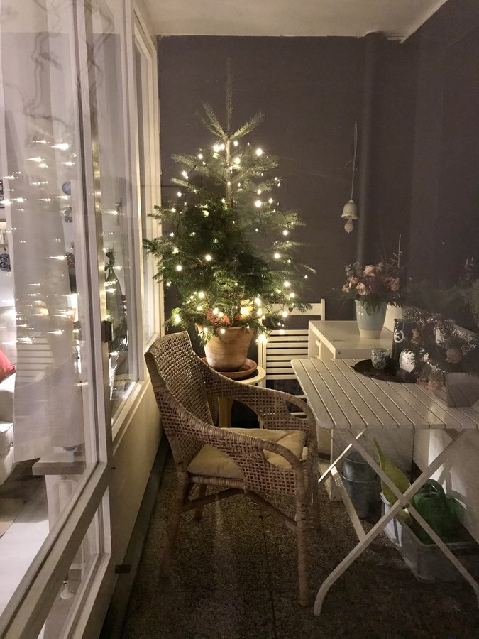 Die Nordmanntanne im Topf bleibt a.d.Balkon, die Lichterkette ist wunderschön, ihr Licht warm und nicht aufdringlich.
