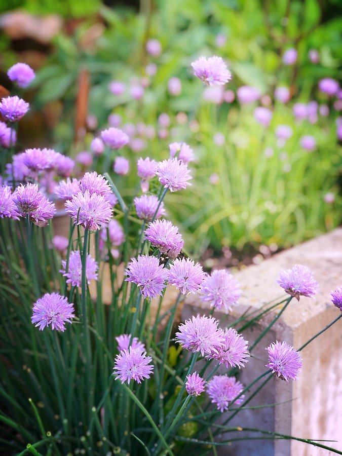 Hier der Anblick ins Kräuterbeet. Herrlich blüht der Schnittlauch.