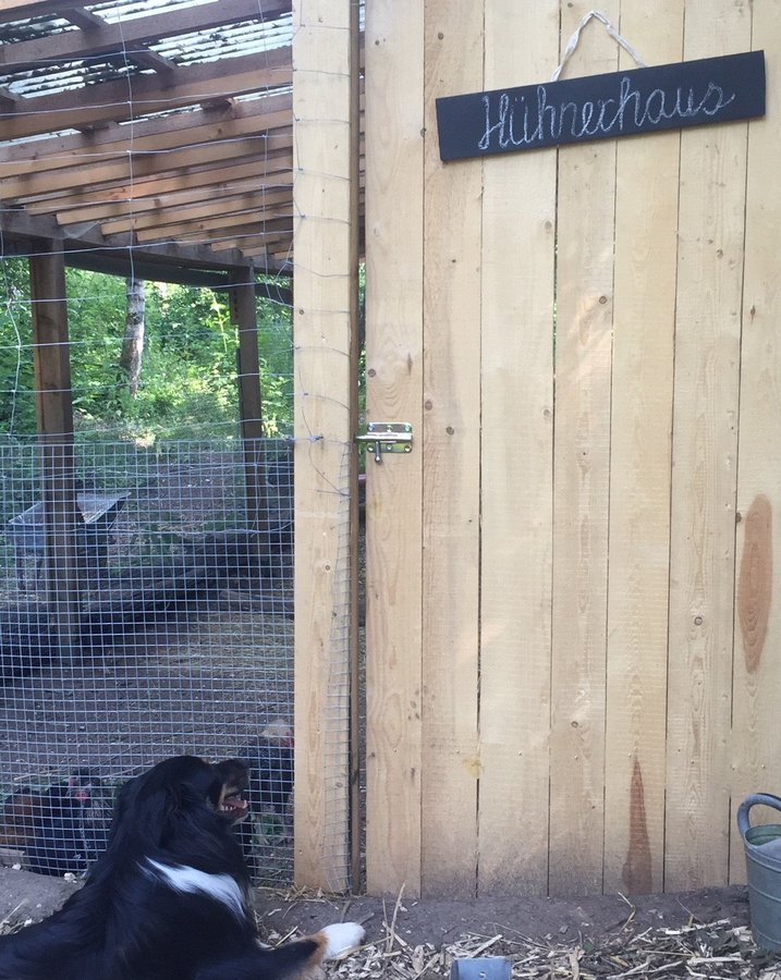 Die Tür zu unserem Hühnerstall. Rusty passt natürlich gut auf!