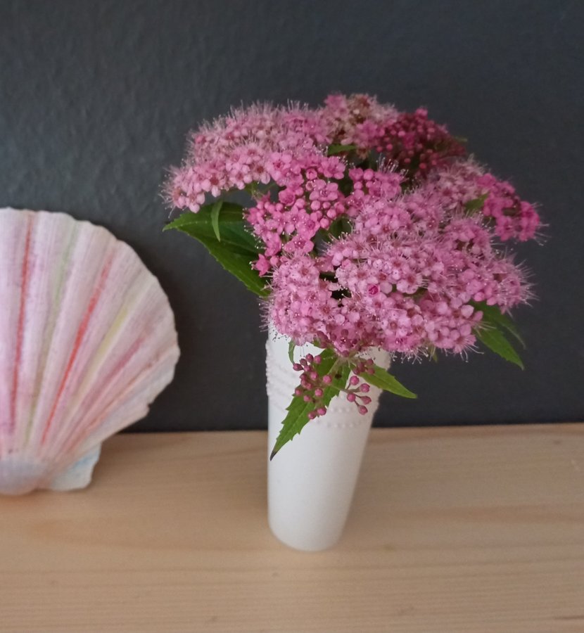 Die von meinen Kindern farblich gestaltete Muschel passt hervorragend zu ihren vom Spaziergang mitgebrachten Blümchen 🌺