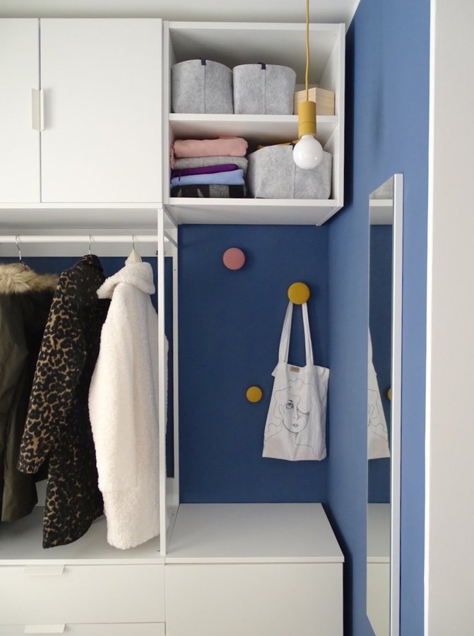Eingangsbereich, Garderobe, Flur, Aufbewahrung, Blaue Wand, Stauraum, Senfgelb, Rosa, Skandi, Skandinavisch, skandinavisch Wohnen, Minimalismus, Wandspiegel, Garderobenspiegel, Blau