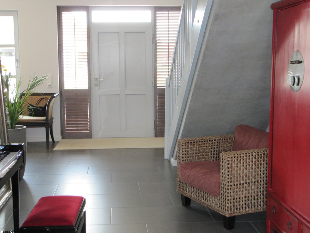 Die Treppe ist aus polierten Beton mit Nussbaum Stufen, darunter stehen zwei meiner Lieblingsstücke, ein Sessel aus Bananengeflecht und ein Hochzeitsschrank ( ein Mitbringsel aus Peking).