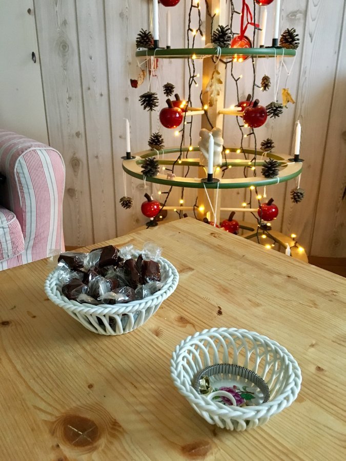 Diese beiden Porzellanschalen haben ihren Weg von meiner Schwiegermama zu mir gefunden. Herr T. war kürzlich in seiner Heimat während ich mal kurz über den großen Teich geflogen bin und hatte sie als Geschenk für mich dabei als er nach Hause kam. Die kleinere Schale nutze ich dazu den Schmuck den ich Abends meist beim Fernsehen ablege aufzubewahren ( sonst lag er immer lose auf dem Tisch, was schon zu einigen Verlusten geführt hat) und die andere für Bonbons, Pralinen .......
