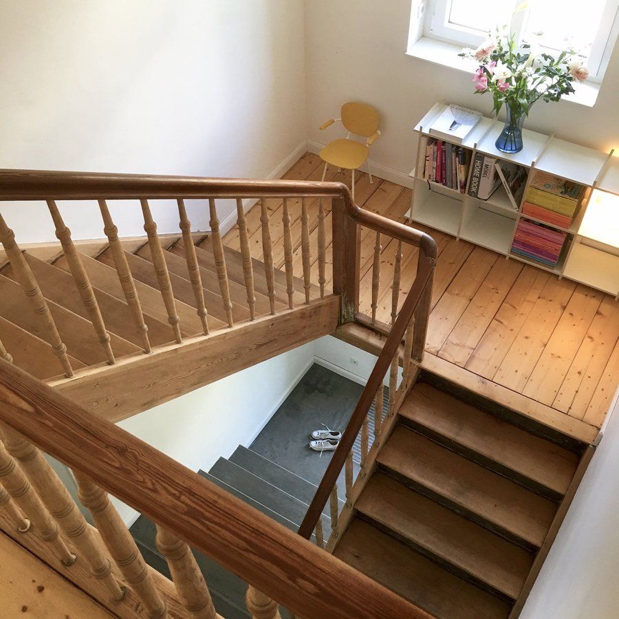 Altbau, Altbauliebe, Treppenhaus, Holztreppe, Gedrechselte Treppensprossen, Betonboden, Holz und Beton