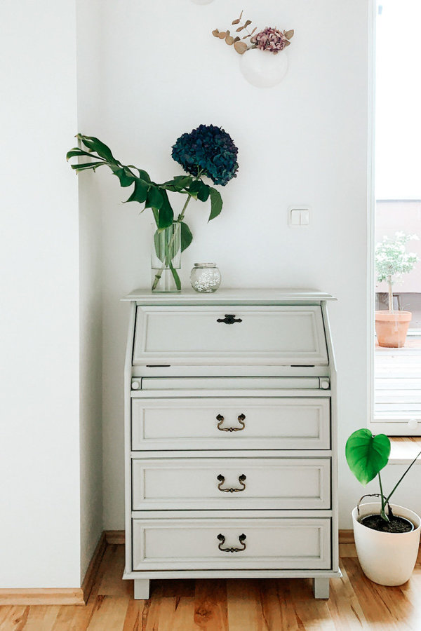 Diesen alten Sekretär habe ich im Sommer in einem Hellgrau gestrichen und aufgemöbelt. DIY-Projekte machen mir immer viel Spaß und vor allem wenn sie sich am Ende so schön in meine Wohnung einfügen.