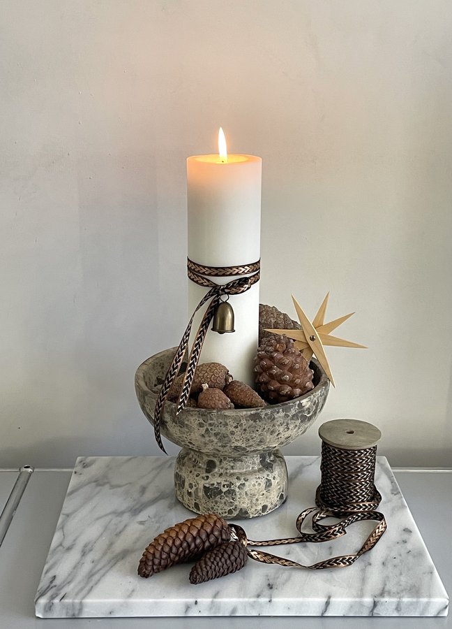 Dieses Jahr hab ich die dicke Altarkerze mit einem Bändchen und einer kleinen Glocke aufgepäppt. Dazu echte Pinienzapfen und die tollscn geschnitten Fichtezapfen aus Südtirol.