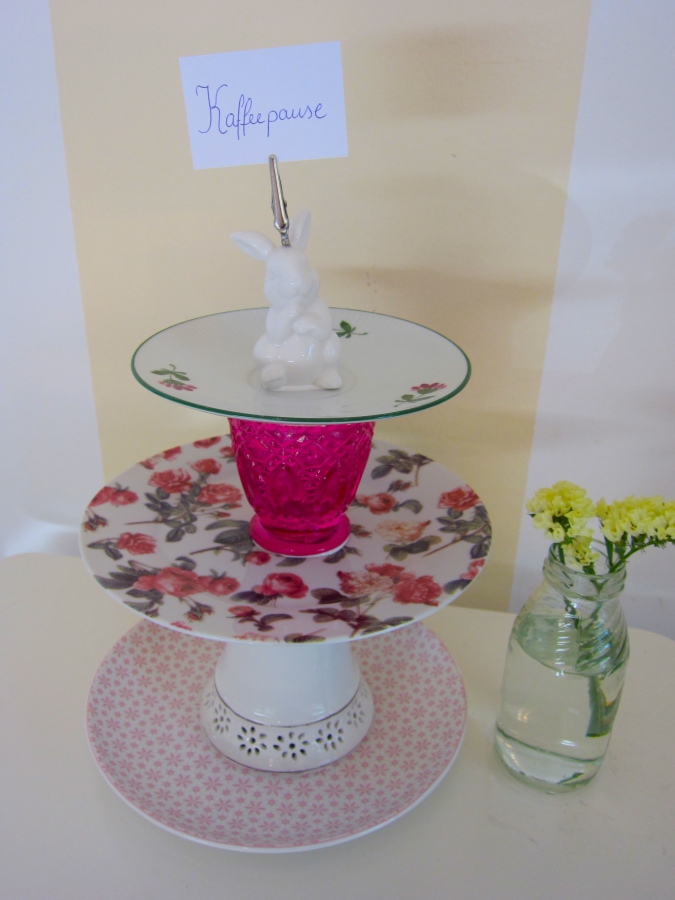 Ich wollte immer eine schöne Etagère haben, die auch bezahlbar ist. Nun habe ich mir bei Trödelmarktbesuchen und bei Ebay schöne Teller gekauft und einfach mal gebastelt. Ich freue mich über meine erste selber gebaute Etagère.