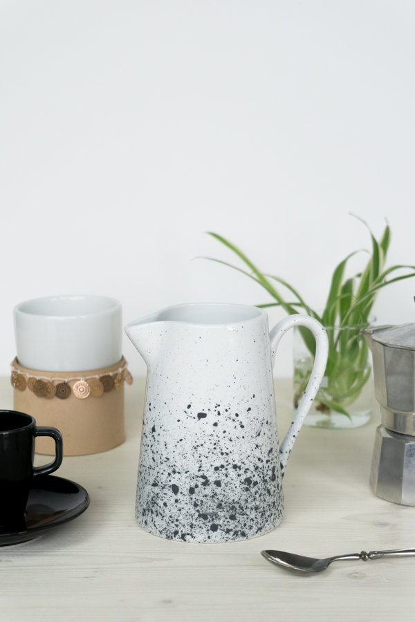 Diy, Do it yourself, Kreativ, Basteln, Deko, Porzellan, Monochrome, Skandinavisch, Handgemacht, Farbspritzer, Tischdeko, Geschirr, Milchkanne, Kanne, Krug, Design, Schlicht