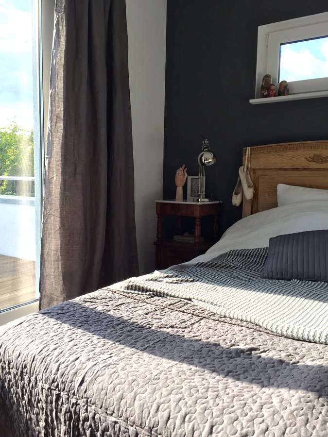 Schlafzimmer, Antikes Bett, Antikes Nachtschränkchen, Leinen, Wandfarbe, Schwarz, Bettwäsche, Textilien