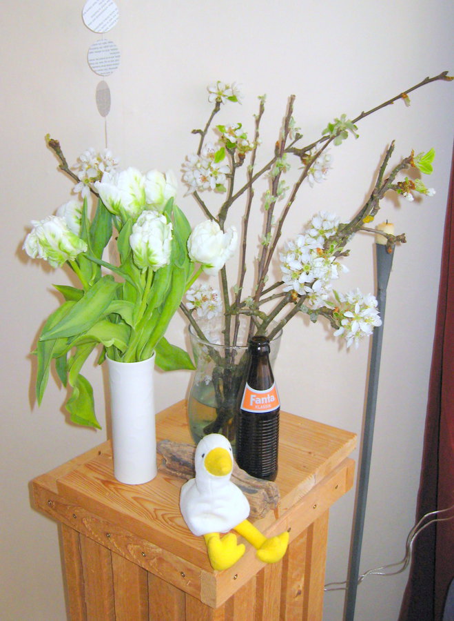 Diese Woche hat gleich zweimal Blühendes bei mir Einzug gehalten: erst wurden während meiner Mittagspause im Schlosspark die Obstbäume geschnitten - schwupps, ein paar Zweige mitgenommen und gestern brachte mein Freund von einer beruflichen Feierlichkeit die "überzähligen" Tulpen mit. Super!