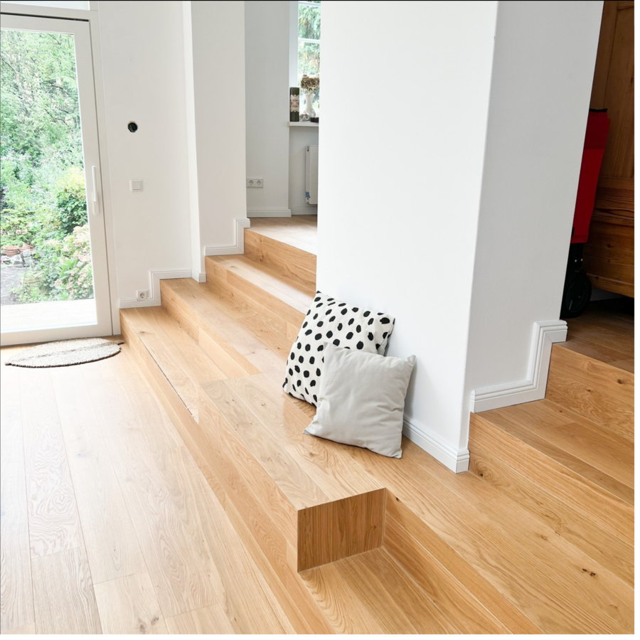 Durch eine schöne Treppe, die Sitz- und Gehstufen kombiniert, wird unser altes Häuschen mit dem Anbau verbunden.
